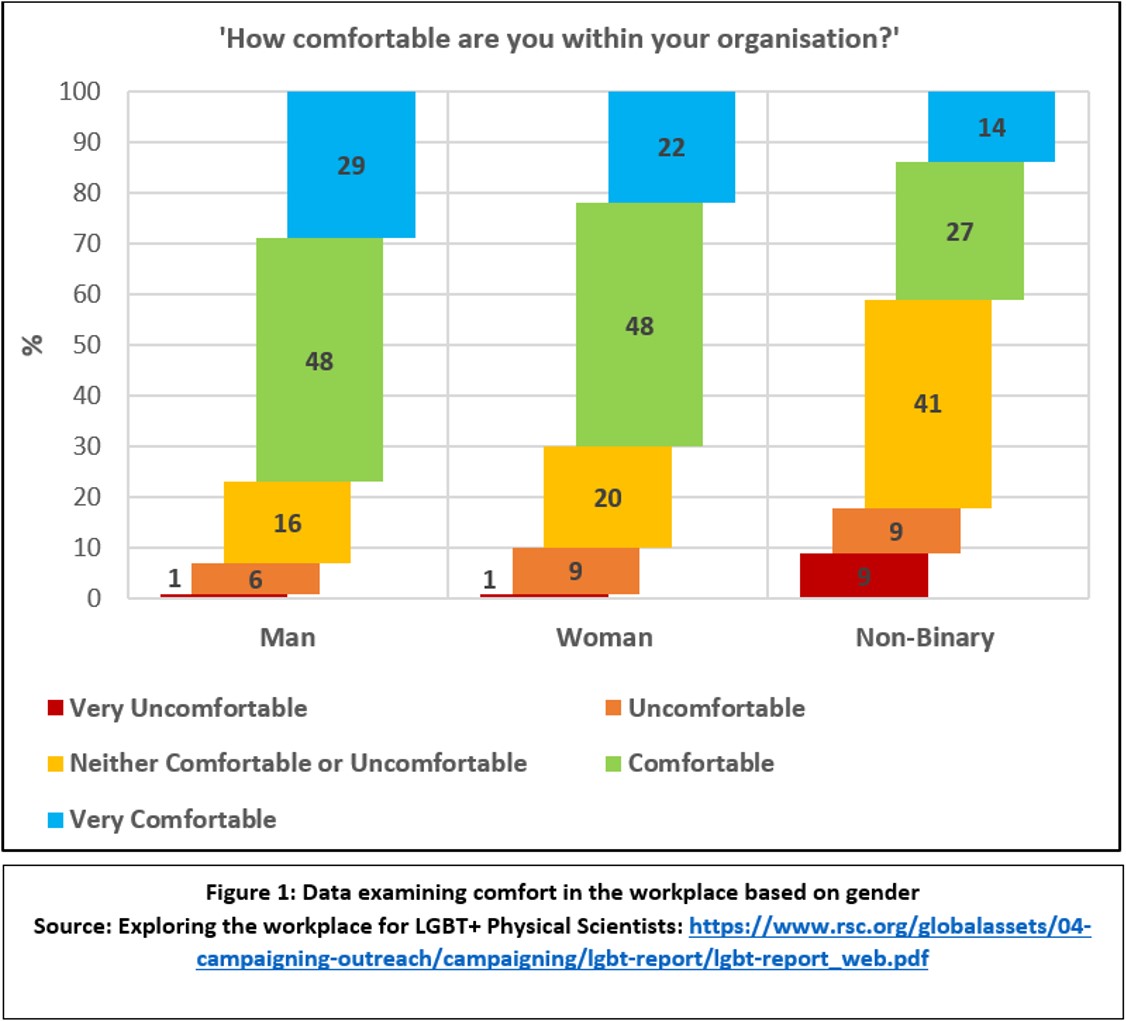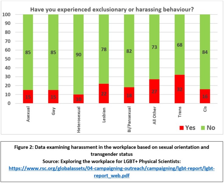 Within the UK, a study from June 2019 from the Institute of Physics, Royal Astronomical Society and the Royal Society of Chemistry showed that members of the LGBTQ+ community are uncomfortable at work or experience some form of harassment (Figures 1 and 2). Over half of trans scientists had considered leaving the workplace because of the work climate and/or discrimination, and 20% had frequently considered leaving their workplace. As a chemist, I myself was saddened to see that chemistry had more instances of exclusionary behaviour compared to other fields.